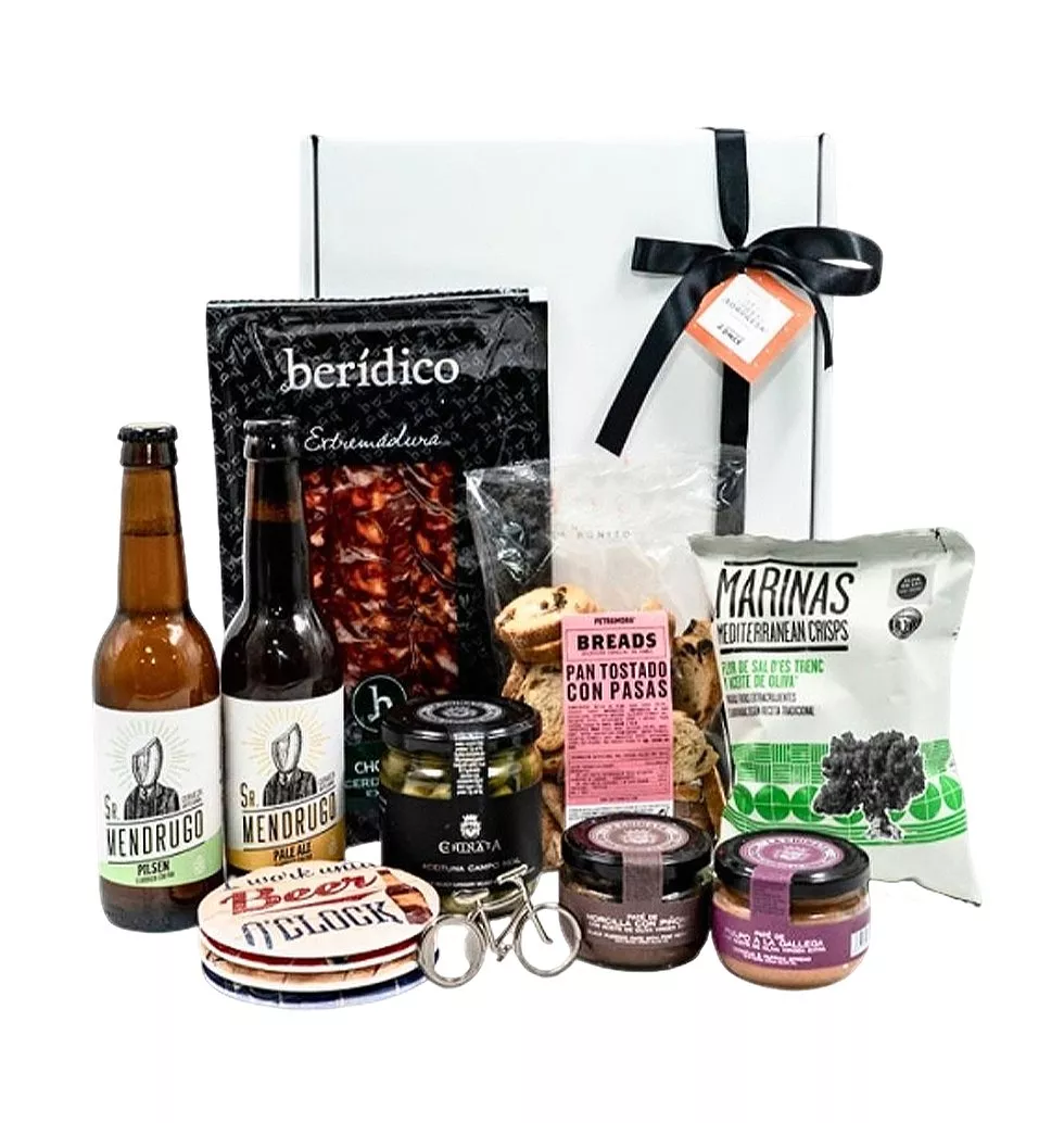 Explore the Taste Bites Collection Tray with our carefully curated gift hamper that embodies the essence of Spanish cuisine. Presented on a classic wicker tray, it includes the celebrated Fuet de Vic from Casa Riera Ordeix, a sensational cured sausage that captures the heart of Spanish charcuterie. Accompanying is the delightful Idiazabal DOP cheese, offering a rich, smoky aspect that's synonymous with Basque flavor traditions. As a maritime treat, enjoy mussels adorned with seaweed in a white marinade, delicately crafted by Porto Muiños to bring coastal Spain to your table. Experience the comforting sweetness of the Eutimio Gastro Rock Cake, a must-try for fans of authentic Spanish desserts. Additionally, our selection includes crackers enriched with extra virgin olive oil and a dusting of sea salt, crafted by The Fine Cheese Company for that perfect crunchy texture. Lastly, enjoy the exquisite almond chocolates by Pablo Garrigós, each piece a testament to Spain's artisan confectionery mastery, concluding a true taste adventure.
